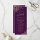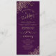 Este belo programa de casamento apresenta uma elegante design com texto dourado sobre fundo roxo de ameixa e caramujos e espirais nos cantos. Os títulos são escritos em caligrafia de rico, e há espaço para seus detalhes de cerimônia e festa de casamento, assim como um obrigado curto para seus convidados. É uma maneira maravilhosa de dar as boas-vindas aos seus amigos e familiares à sua celebração de casamento.