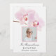 Lembre-se do seu amado e comemore sua vida com as elegantes e simples Flores Orquídeas Rosa no Programa de Memória Funeral Branca. Esta típica linha cronológica do serviço de homenagem à morte floral apresenta uma fotografia floral serena e sofisticada de flores de orquídea da fantasia das rosas claro bonito no caule com um fundo branco. Personalize-o com uma fotografia do falecido, das datas de nascimento e morte e da ordem da cerimônia de celebração do serviço da igreja.