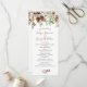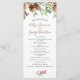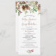 Elegante Programa de Casamento Verde de inverno. Este design apresenta uma ilustração de ramos de pinheiros e cones com bagas vermelhas no estilo aquarela em fundo branco. Você pode ajustar o texto de acordo com as suas necessidades.