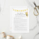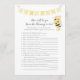 Um jogo divertido para o chá de fraldas é o jogo Quem sabe ser mamãe? Este jogo tem uma faixa amarela no topo e um ursinho de pelúcia com uma abelha. Ao contrário, um ursinho de pelúcia se debruça sobre um barril de mel observando uma abelha de mel com modelos.