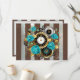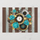 Relógio antigo e patenteado, adornado com joias, mãos de ouro e algarismos latinos com rosa de turquesa sobre fundo castanho e listrado. Estilo Steampunk.