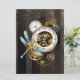 Marcações antigas com engrenagens de ouro e latão, decoradas com libélula mecânica sobre fundo castanho e listrado. Steampunk.