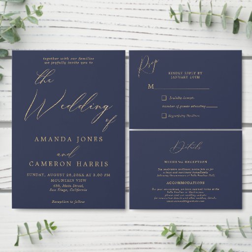 Este programa de casamento triplo contém letras de caligrafia dourada e um fundo azul marinho com uma fotografia. Personalize com seus detalhes de casamento e encontre designs correspondentes na minha loja "DreamHut".