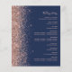 A borda esquerda deste elegante programa de casamento moderno apresenta uma borda falsa de ouro rosa. O texto personalizável combina a letra rosa rosa branca e manuscrita e as fontes em um fundo azul marinho.
