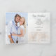 Lindas colunas de elegantes rosas cor-de-água, pincéis, cor-de-rosa, e folhagem verde sobre um sutil fundo de aquarela pastel e etiqueta central com bordas douradas. Apresenta gráficos de texto de caligrafia na fonte de script personalizada (ou exclui e personaliza no editor de design) com campos de texto editáveis para os detalhes da sua cerimônia e participantes do casamento. O dentro também apresenta um modelo de foto opcional.