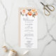Este programa de casamento rústico de flores de terra é perfeito para um casamento outono. O elegante design de tons de terra apresenta flores de aquarela rústicas em terracota, cobre, laranja queimado, pêssego, rosa esbranquiçado e branco creme com estilo vintage boho. Inclua o nome da noiva e do noivo, a data e o local do casamento, a mensagem do obrigado, a ordem do serviço, a festa noiva e um memorial "em memória amorosa" opcional.