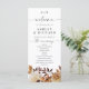 Bem-vindo ao outono no seu dia especial com o programa de casamento "Rustic Fall Leaves". Apresentando a beleza natural e o calor das vibrantes folhas do outono, combinado com um delicado estilo rústico, este programa irá lindamente complementar a vossa atmosfera de casamento. Não só ajuda os hóspedes a seguirem a cerimônia, como também serve como um maravilhoso manejo que deixa uma impressão duradoura para todos.