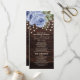 Madeira rustica castanha escura com luzes de cordas e azul-impermeável programa de casamento floral. Entre em contato conosco para obter ajuda sobre a personalização ou produtos correspondentes.