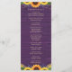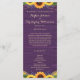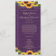 Este design rustico apresenta luzes de cordas de ouro e rendas junto com girassóis e lavandas contra um fundo de madeira roxa. O texto, com nomes personalizáveis de noiva e noivos e detalhes de eventos, aparece em ouro pálido na escrita popular e na tipografia serif. Você pode personalizar este programa para seu próprio casamento mudando o texto na modelo.