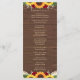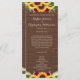 Este design de campo rústico apresenta luzes de cordas brancas ouros, rendas vintage, girassóis amarelos, rosas vermelhas de burgundy de marrom e o hálito do bebê branco contra um fundo de madeira marrom-escura. O texto personalizável aparece na frente e no verso em branco-ouro em um roteiro popular e uma tipografia serif no mesmo fundo de madeira marrom-escura. Você pode personalizar este programa para seu próprio casamento mudando o texto na modelo.
