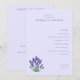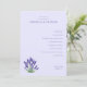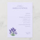 This elegant wedding program features a serene lavender background with a simple, sophisticated layout. The design includes a watercolor illustration of lavender flowers in the lower left corner, adding a touch of natural beauty and softness. The text is arranged in a clear, organized manner using a classic serif font, creating a harmonious contrast against the light backdrop. Perfect for a formal wedding ceremony, this program exudes a tranquil and romantic atmosphere, making it an ideal choice for couples seeking a refined and gentle aesthetic.