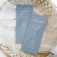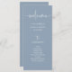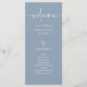 Estes elegantes, empoeirados programas de boas-vindas ao casamento azul e branco são simples e minimalistas, mas muito na moda devido ao moderno roteiro escrito à mão e ao layout limpo. Adicione facilmente sua ordem de cerimônia e os nomes de sua festa de casamento.