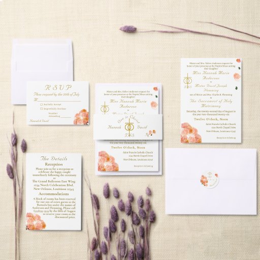 O cobrir design apresenta o símbolo tradicional de cruz e anéis para o casamento no canto superior esquerdo. O cabeçalho personalizável é exibido em uma fonte Nupcial elegante que exibe nomes de noiva e noivo. A data e o nome da igreja são também apresentados abaixo. Lindas imagens de pêssego e rosas de cor terracota agravam os cantos. Dentro apresenta o formato tradicional de um casamento católico. Cobrir traseiro exibe a foto que você fornece junto com a mensagem de gratidão. Todo texto é personalizável. Possui espaço para até sete damas e padrinhos de casamento. Projetado para coordenar com a "Suíte de Casamento Católico de Terracotta".