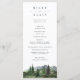 Comemore sua cerimônia em estilo com este programa de casamento de dois lados da coleção Timberline da Redwood & Vine Design Co. Apresentando montanhas de cor aquática verde tranquila e sotaques de pinheiros, este layout elegante oferece um formato limpo e moderno para os detalhes da sua timeline de cerimônia e festa de casamento. Perfeito para casamentos rústicos minimalistas, comemorações de inverno ou eventos elegantes ao ar livre cercados pela natureza. Personalize o texto para se adequar à sua celebração exclusiva.