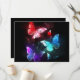 Três borboletas luminosas, vermelhas, roxas, verdes, texturizadas, noturnas sobre fundo luminoso preto.