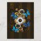 Composição do relógio de aço redondo com discagem numérica romana preta, decorado com engrenagens de ouro e latão, borboletas morfo azuis e lentes danificadas sobre fundo listrado castanho. Estilo Steampunk.