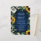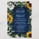 Design apresenta um fundo de madeira marinho azul de celeiro decorado com margaridas, girassóis, verde, eucalipto, hálito de bebê e lírio do vale.