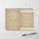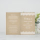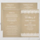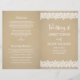 Uma delicada renda branca emoldura um fundo bege quente neste programa de cerimônia rústica. "Casamento de" aparece em tipografia elegante, emoldurando seus nomes e detalhes do casamento para um design romântico inspirado no campo, com um forro combinando com acabamento em renda. As páginas internas são totalmente personalizáveis para sua festa de casamento, ordem da cerimônia e uma mensagem pessoal de agradecimento na contracapa. Os programas são impressos em papel de peso texto e chegam planos, exigindo uma simples dobra no centro.