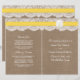 A coleção de casamentos de areia amarela é um design impressionante que apresenta um adorável fundo de efeito de burvolta rústico com uma trim romântica de efeito de renda branca vintage terminada com um incrível dólar de areia e fita amarela. Esses programas podem ser personalizados para sua ocasião especial e fariam a modelo perfeita para casamentos, chás de panela, festas de noivado, festas de aniversário e muito, muito mais. *Observe que o Zazzle só vende produtos impressos para que este item não tenha nenhum material real de burlap, renda, dólar de areia ou fita.