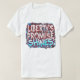 Uma camiseta inspirada na vintage, com as palavras "Liberty's Promise Shines" em uma fonte angustiada, escrita à mão, que lembra uma bandeira americana clássica.