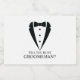 Torne o seu casamento inesquecível - Adicione um toque pessoal com uma proposta de padrinho de casamento etiquetas de vinho espumante com um terno de smoking preto e uma ilustração de gravata de arco, com uma mensagem de proposta em uma fonte de serifa clássica.