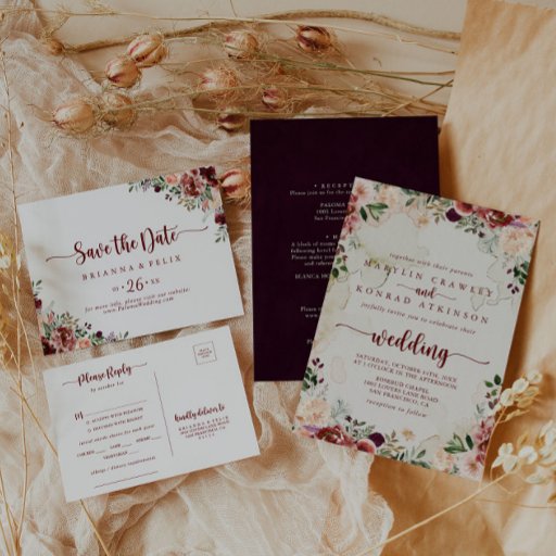 Esta rústica proposta de vinho espumante de uma madrugada de verão é perfeita para um casamento simples. A design apresenta flores de aquarela, cor-de-rosa e borbulhante, com folhas verdes em fundo castanho manchado. Mude o texto para pedir a todos os membros do seu partido noivo.