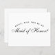 Uma simples proposta de dama de honra minimalista: apenas texto preto em fundo branco. As palavras Dama de Honra na frente e a mensagem no verso são escritas em uma elegante fonte caligráfica, o texto arqueado "[Nome] você será minha" em letras maiúsculas pequenas.