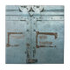 Porta metálica de cinza turquesa com fechaduras, rodas, texto e fita-cola. Fotografado num antigo edifício no País de Gales, editado. Por Alexandra Cook aka Linandara.