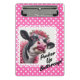 Uma miniprancheta de vidro branca e divertida com fundo polca rosa e branco pontilhado, uma vaca preta e branca vestida vestindo óculos rosa, vestido rosa e pérolas. O cadarço ao redor da vaca e o ditado, Pucker Up ButterCup! no canto.