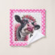 Um pano de lavagem caprichoso e divertido com fundo polka rosa e branco, uma vaca branca e preta vestida vestindo óculos cor-de-rosa, vestido rosa e pérolas. O cadarço ao redor da vaca e o ditado, Pucker Up ButterCup! no canto.