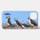 Puffins em repouso nas rochas. O texto personalizável lendo "Puffins" também é exibido. A Puffin do Atlântico (Fratercula arctica) se alimenta principalmente por mergulho na água. Criam-se em grandes colônias em penhascos costeiros ou ilhas offshore no Atlântico Norte. Os alfinetes derramaram as partes coloridas das suas contas após a época de reprodução, deixando um bico menor e mais aborrecido. Suas asas curtas são adaptadas para nadar com uma técnica voadora sob água. No ar, batem suas asas rapidamente (até 400 vezes por minuto) em um voo rápido, muitas vezes voando baixo sobre a superfície do oceano.