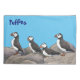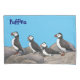 Puffins em repouso nas rochas. O texto personalizável lendo "Puffins" também é exibido. A Puffin do Atlântico (Fratercula arctica) se alimenta principalmente por mergulho na água. Criam-se em grandes colônias em penhascos costeiros ou ilhas offshore no Atlântico Norte. Os alfinetes derramaram as partes coloridas das suas contas após a época de reprodução, deixando um bico menor e mais aborrecido. Suas asas curtas são adaptadas para nadar com uma técnica voadora sob água. No ar, batem suas asas rapidamente (até 400 vezes por minuto) em um voo rápido, muitas vezes voando baixo sobre a superfície do oceano.