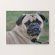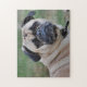 Uma fotografia de um pug adorável com uma parte de grama que cola fora de sua boca como olha fixamente na câmera.