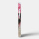Pug dog com a língua para fora com uma fita rosa sequenciada, fundo branco.