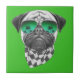 Características deste design um retrato do pug dentro com óculos de sol e um lenço checkered preto e branco.