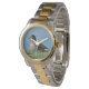 Um pato sentado na vegetação perto da costa com o lago ao fundo. Disponível em todos os estilos de observação. Os números/marcas podem ser ajustados ou removidos conforme desejado.