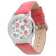 Um relógio de pulso de criança legal, com um padrão de corujas bonitinhas em vermelho, azul, verde sobre um fundo branco que você pode mudar facilmente usando o botão de edição. A correia é vermelha e o padrão coruja é de um design de colagem de papel pintado manualmente de origem por Judy Adamson.
