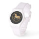 Um relógio de pulso branco na moda com um cavalo de efeito ouro sobre um fundo preto que você pode mudar se quiser. O motivo do cavalo foi pintado manualmente por Judy Adamson.