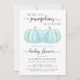 Um belo convite para o chá de bebês gêmeos, com "Duas Pequenas Pumpkins Doce Estão a Caminho" escrito numa mistura de tipografia moderna de cinza mole e roteiro de na moda, e duas aquarelas de abóbora azul pastel. Você pode personalizar o nome da mãe e os detalhes do chá em uma simples tipografia de cinzas.