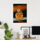 Poster do Dia das Bruxas com a design de Mess Pumpkin. Uma linda abóbora gostando de doce de Halloween em cima de uma abóbora pai não tão feliz. Cor preta e laranja.