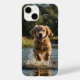 Um filhote de ouro alegre a divertir-se ao sol, a saltar através de água cristalina.