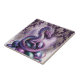 A fantasy digital art piece of a majestic purple and blue dragon curled around a stack of glowing purple and turquoise stones. The dragon has iridescent scales with a gradient from deep purple to bright blue, detailed with intricate patterns and spikes along its back. Its body is coiled in a graceful S-shape, resting on and wrapping around several large, smooth stones of varying sizes. The stones emit a soft purple glow and are partially submerged in a reflective purple-tinted water at the bottom of the image. The background features an ornate damask pattern in light beige against a deep purple backdrop, creating an elegant Victorian atmosphere. The dragon's head is raised in a regal pose, with pointed ears, a long snout, and glowing yellow eyes. Its tail curls around the stones in a decorative manner. The overall composition has a mystical, ethereal quality with a purple and blue color scheme that creates a cohesive, fantasy-like atmosphere.