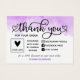 Obrigado pelo folheto de compra em um design bonitinho com um roteiro bonito decorado com corações contra uma lavagem de aquarela em roxo. Personalize com o logotipo de sua empresa e suas contas de mídia social. Você também pode anotar um código de desconto para a próxima compra de seus clientes.