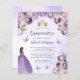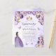 Este adorável convite da quinceañera mostra uma fronteira de flores roxas e marfim em um fundo de aquarela púrpura pálida. Uma tiara dourada, uma menina de cabelo escuro em um vestido princesa roxo e pequenas borboletas roxas decoram o texto. A palavra "Quinceañera" e o nome do convidado de honra aparecem em um guião elegante de escrita manual roxa, com o texto remanescente na fonte serif cinza.
