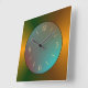 Um simples relógio de cozinha envolvente com reflexos de ouro. Um centro redondo com aqua verde e pistas de vermelho. Uma fina borda preta com mãos pretas complementa o design. Disponível em formas redondas e quadradas.