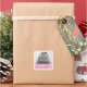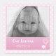 Adesivo personalizável com informações sobre fotografia e nascimento. Bolinhas rosa e branca