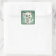 A imagem adorável de um gatinho branco segurando um trevo é apresentada neste adesivo quadrado para o Dia de São Patrício. Com a mensagem, "Feliz Dia de São Patrício", use este adesivo para aqueles envios especiais, decoração, scrapbooking e mais para o feriado irlandês!
