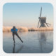 Um adesivo fotográfico com um atleta patinando em um rio congelado passado por reles de fosco de capuz e um moinho de vento em uma bela manhã de inverno nos Países Baixos.