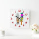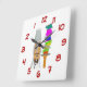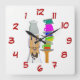 Sentindo que quer voltar o relógio para outra hora? Aqui está um relógio para ajudá-lo com isso. os números estão ajustados para trás. Talvez não consiga voltar as mãos do tempo, mas este relógio faz-nos pensar que podemos. Desenho de um garçom branco com bigode e carregando de arco, uma pilha de diferentes copos de café coloridos. Uma imagem divertida para amantes do café.