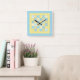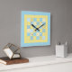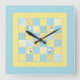 Um Relógio de Parede Quadrado divertido, com um design de Patchwork Faux de Motoses e padrões de Ovelhas em Blues e Yellows, agrupado com a coordenação de Check Ginghams e Polkas Dots.